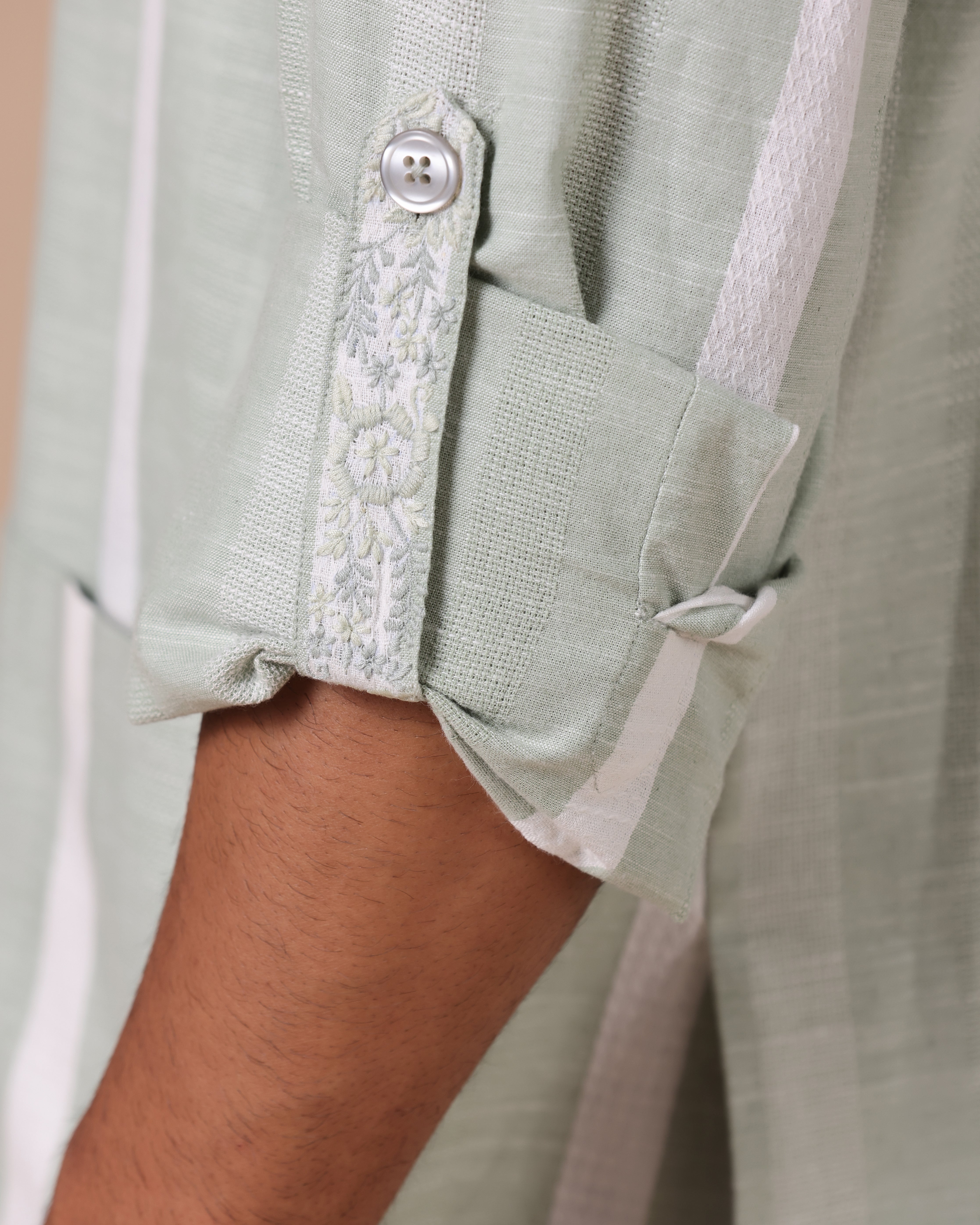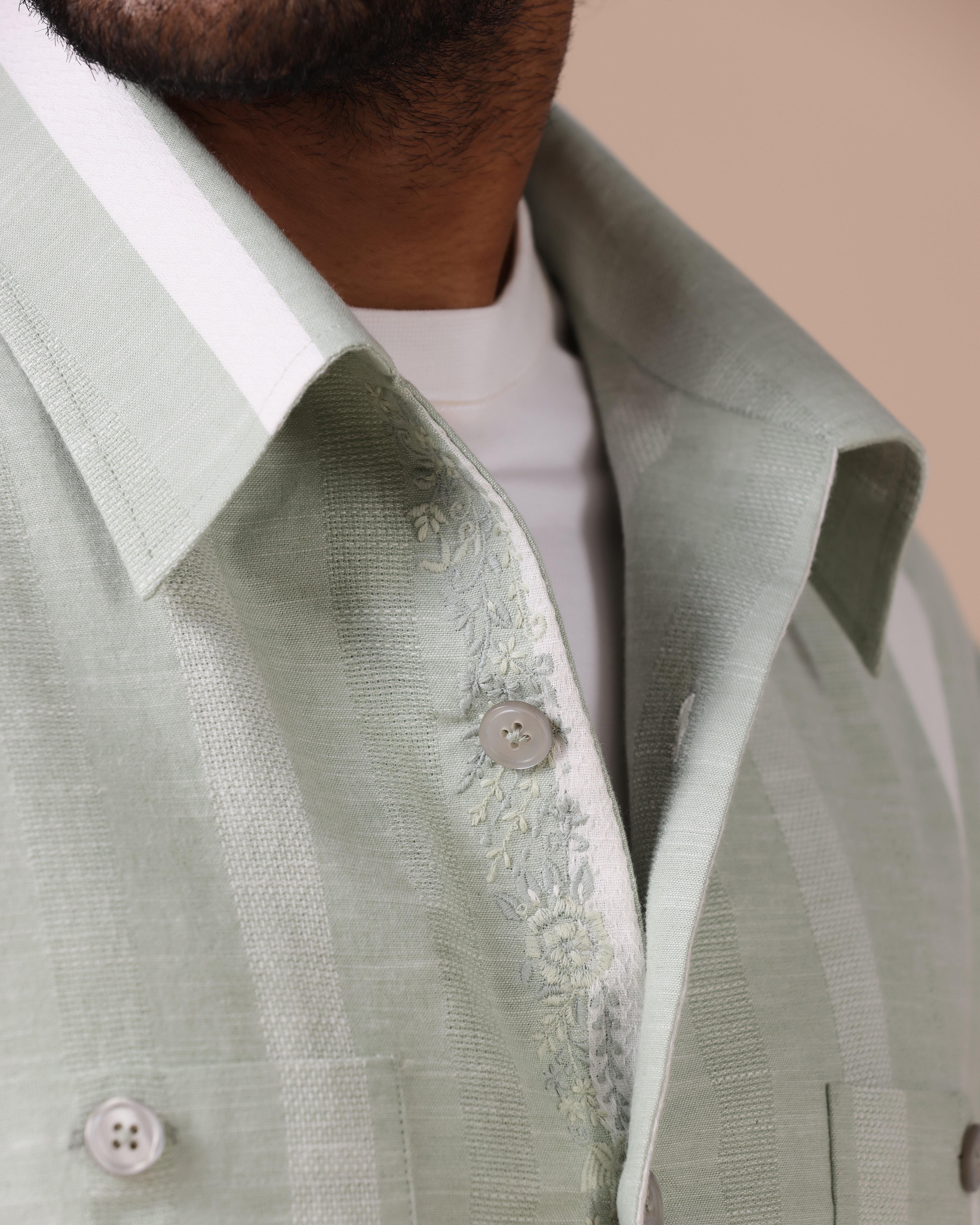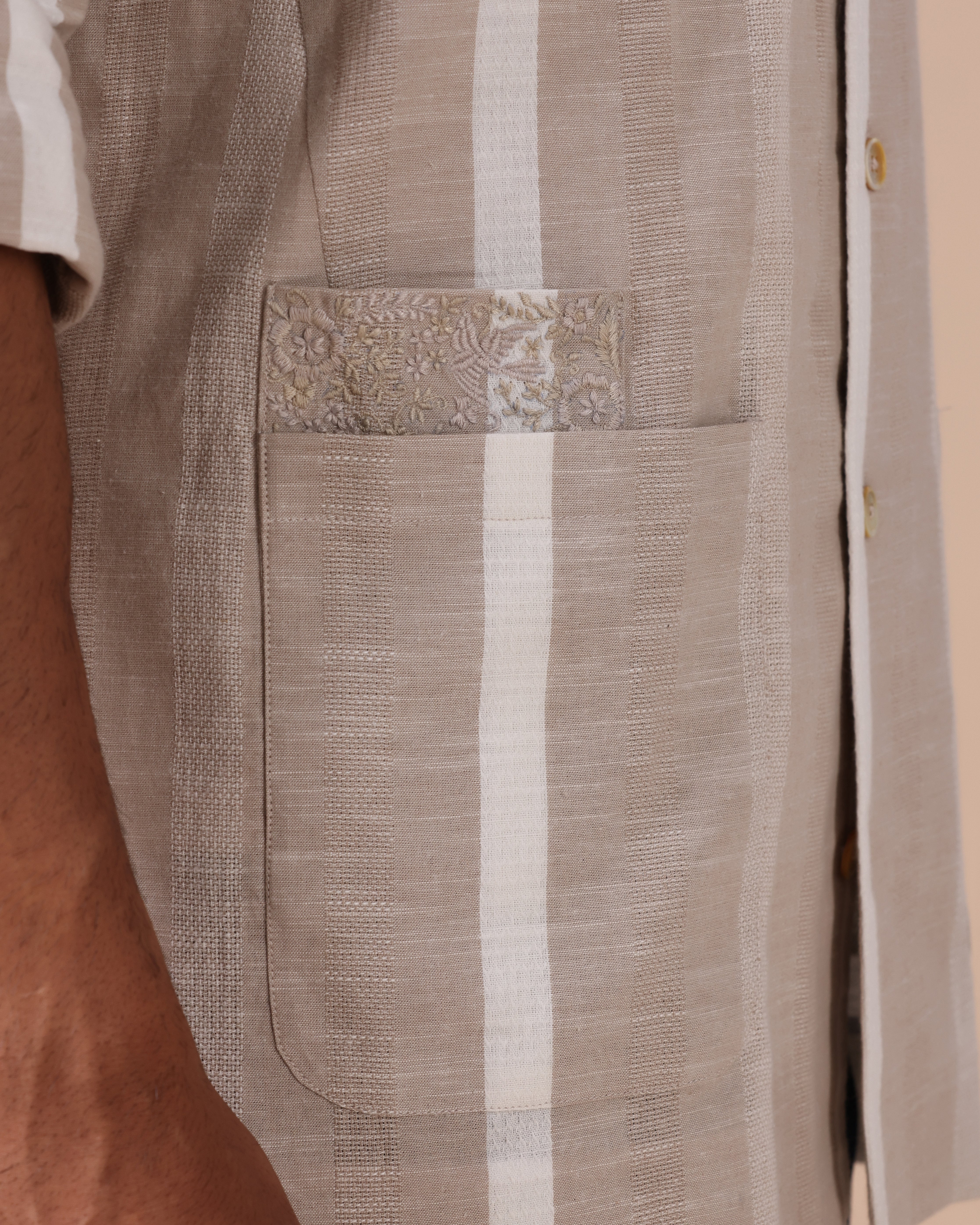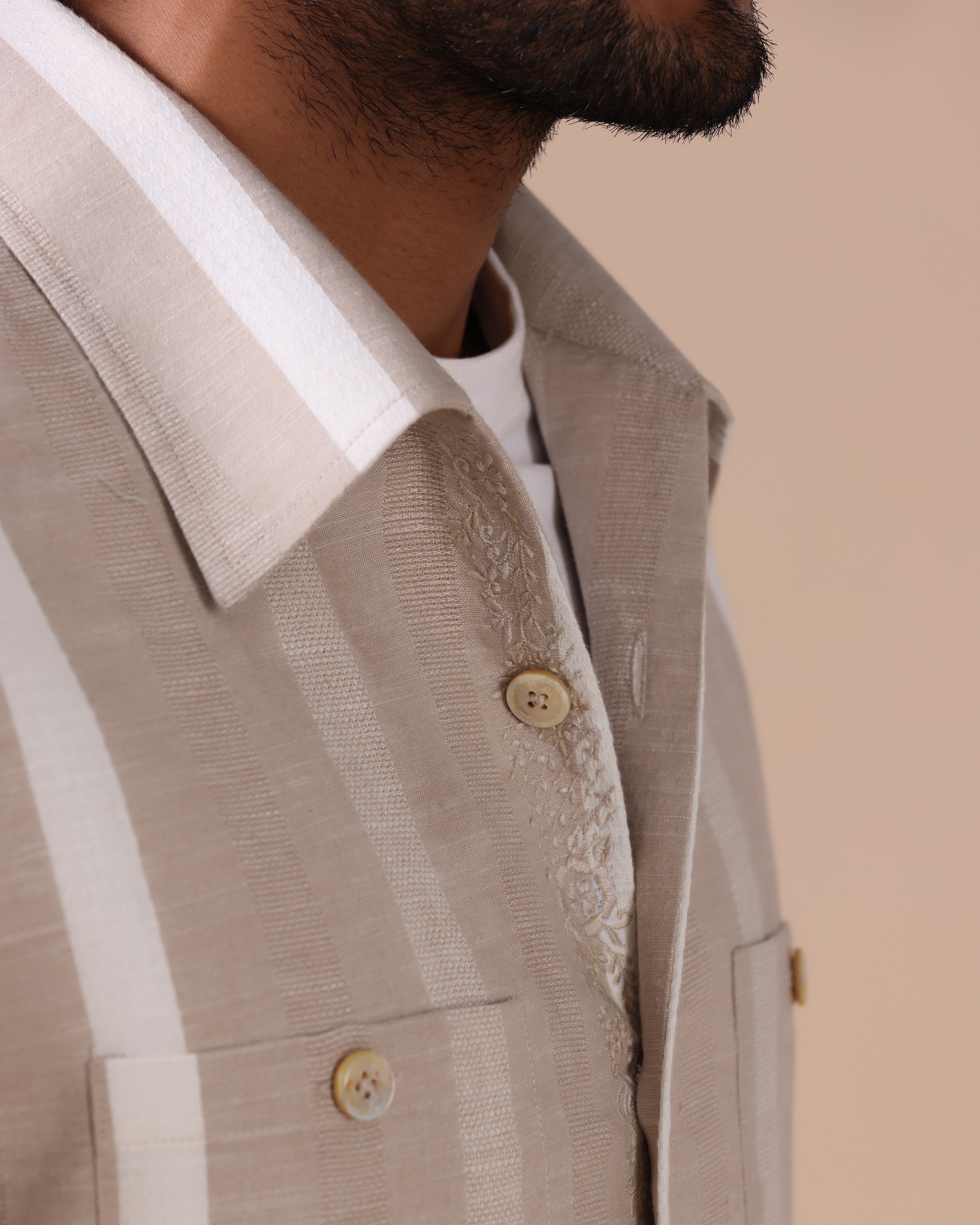 Brushed Cotton Linen Shacket with Embroidered Placket Detailing