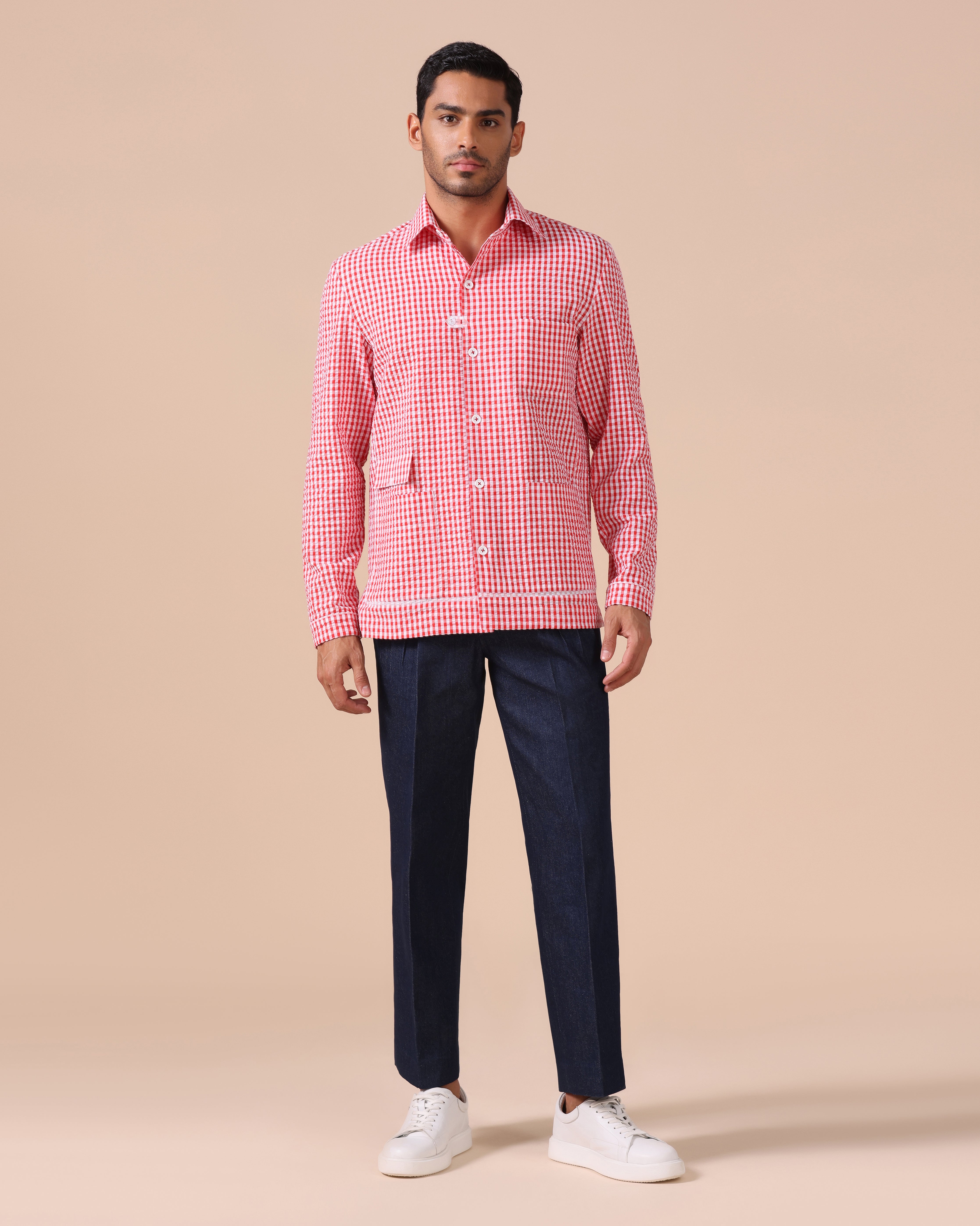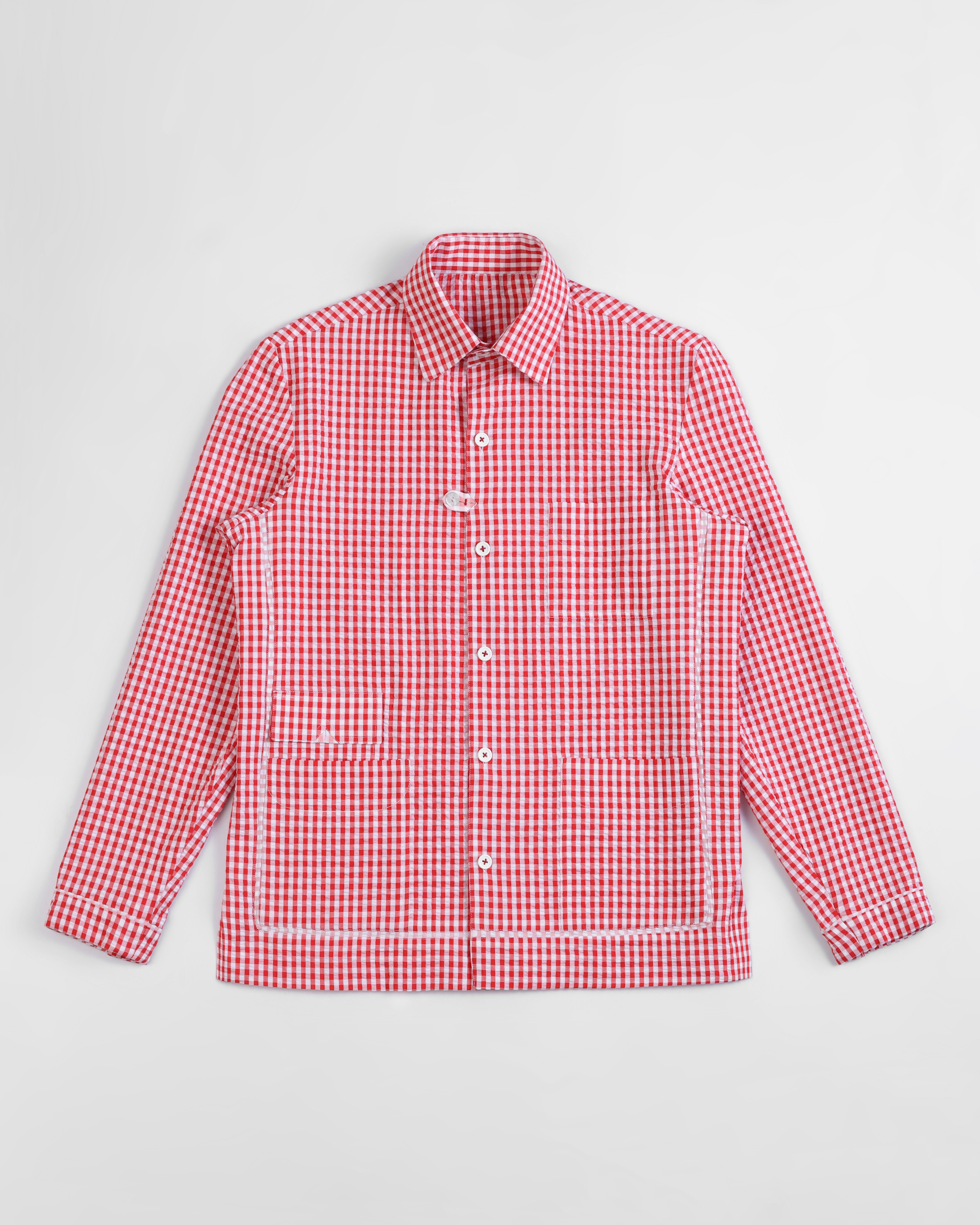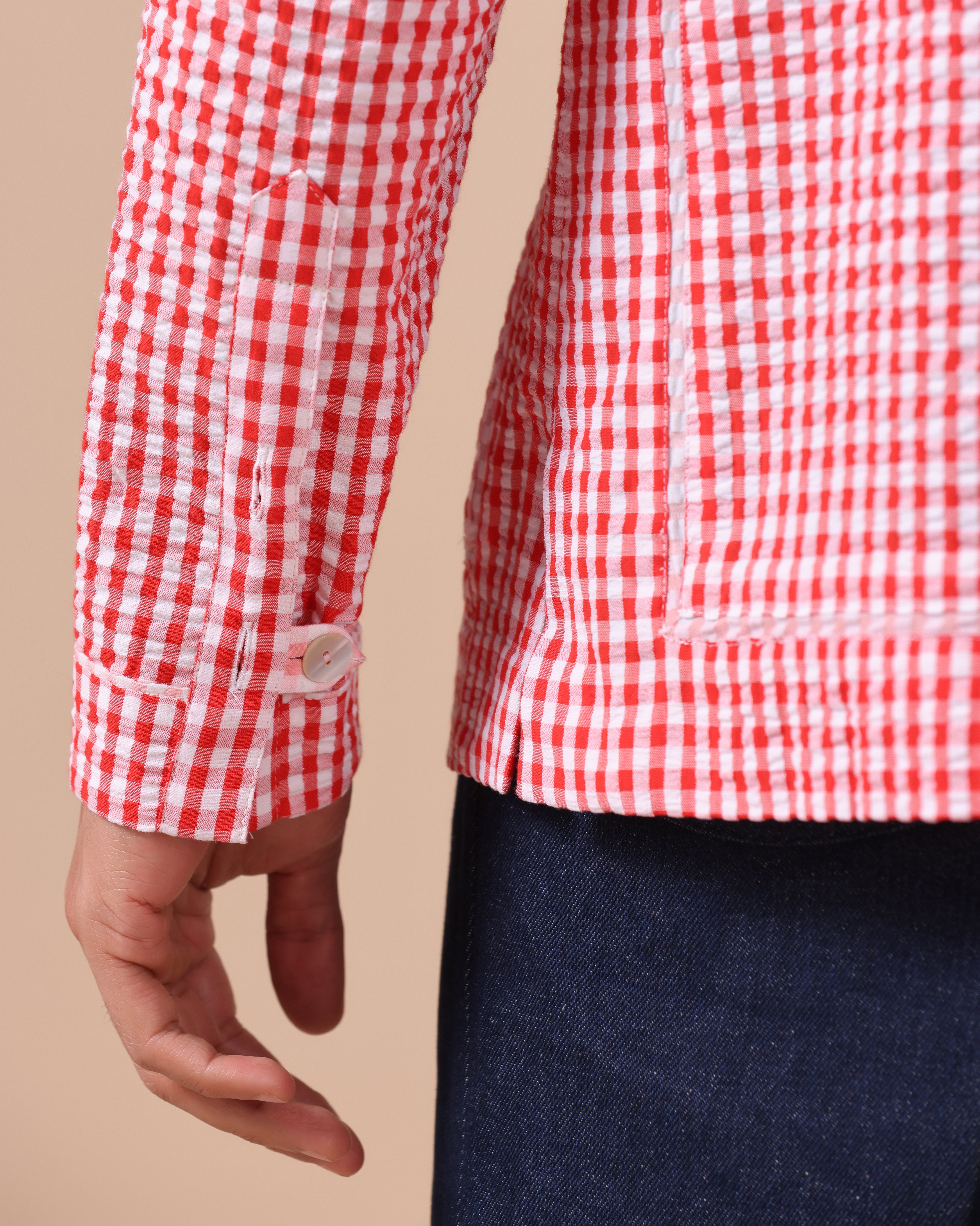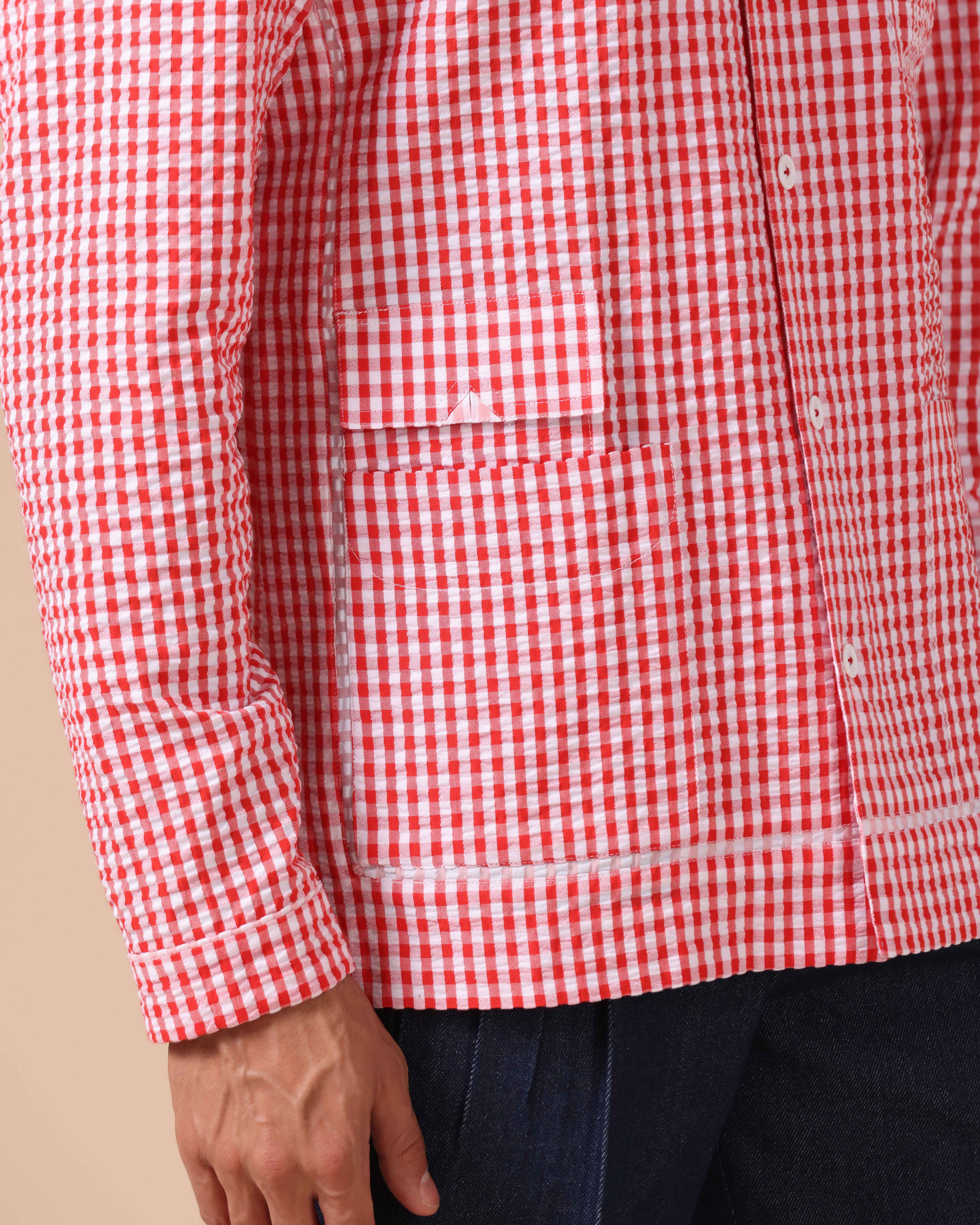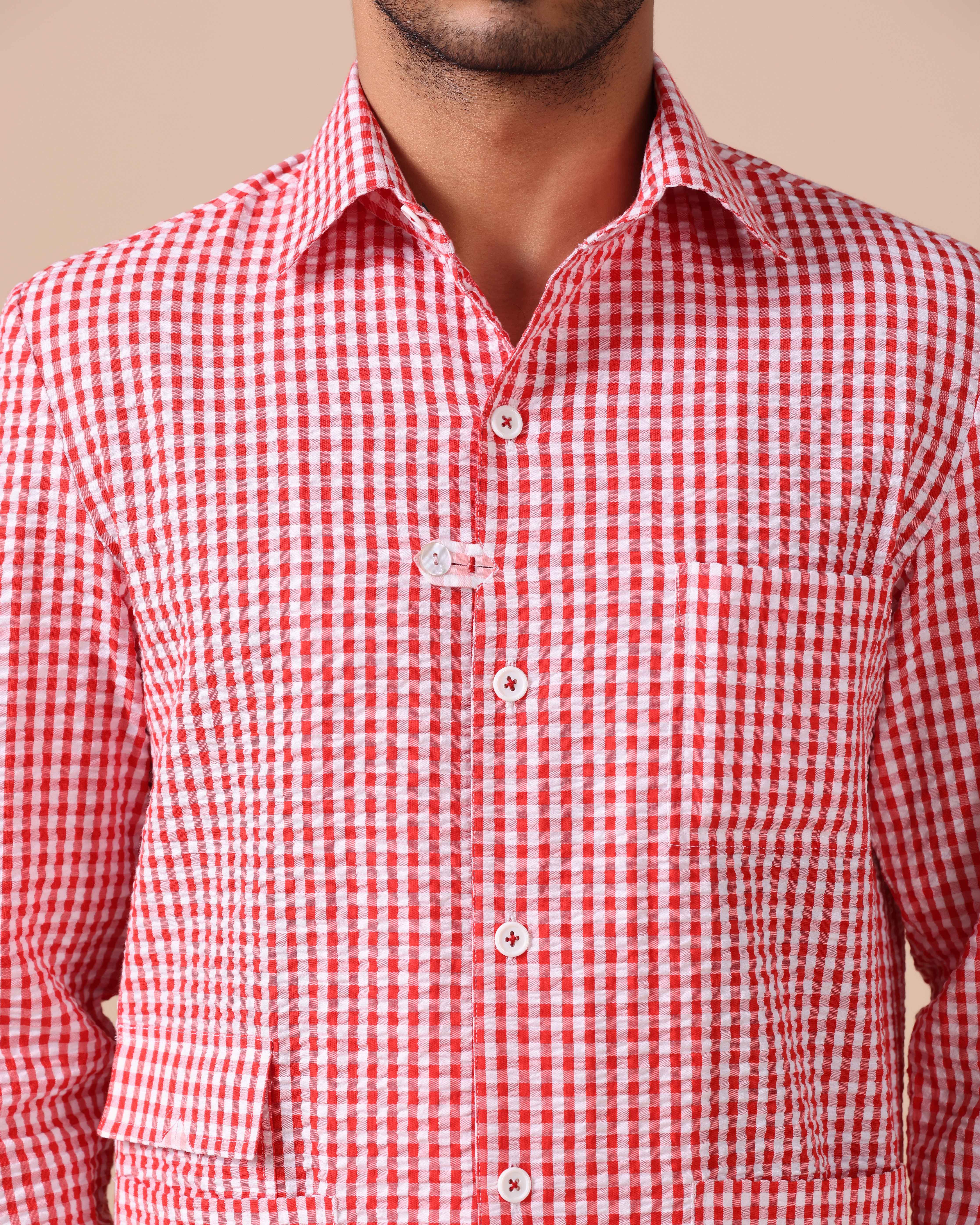 - Bold Aesthetic: Red and white seersucker check pattern adds a striking, casual flair