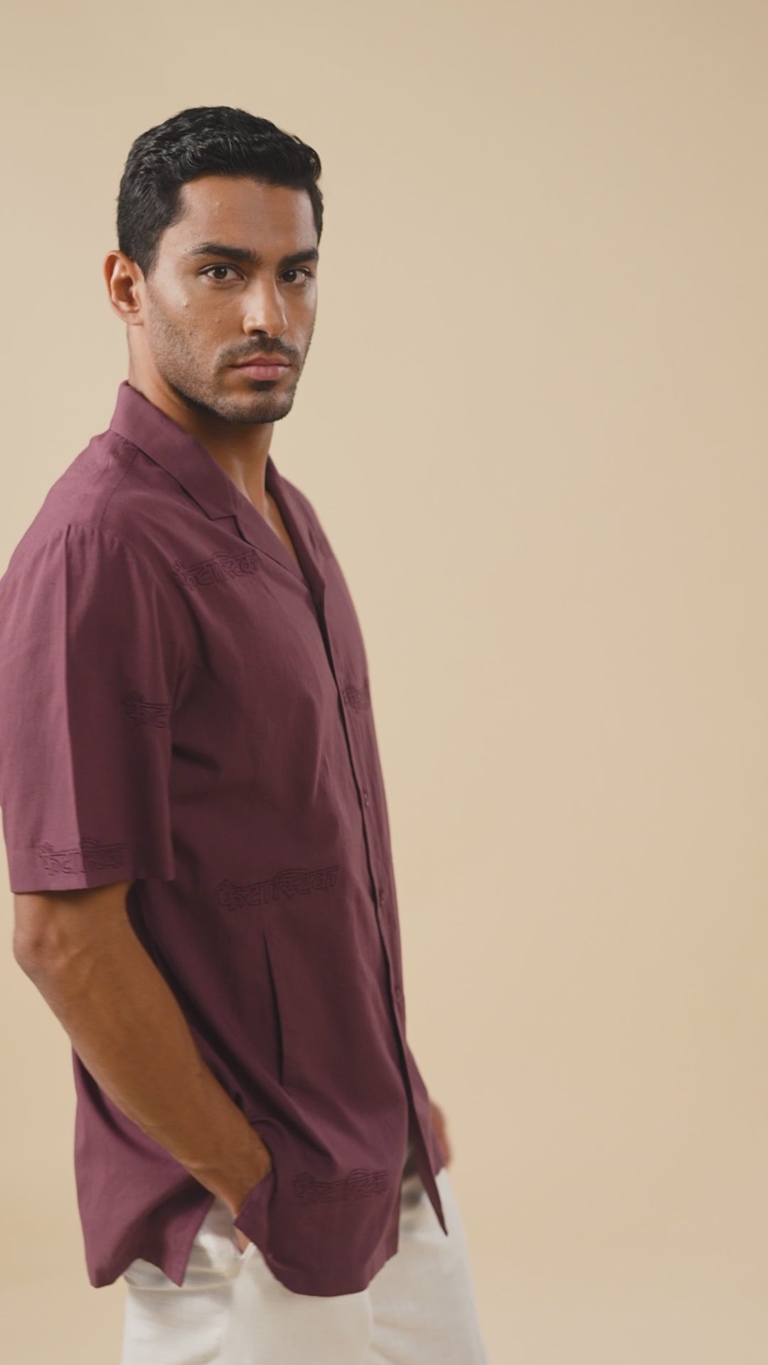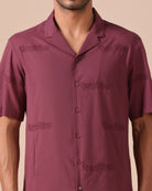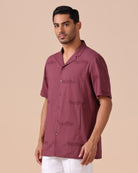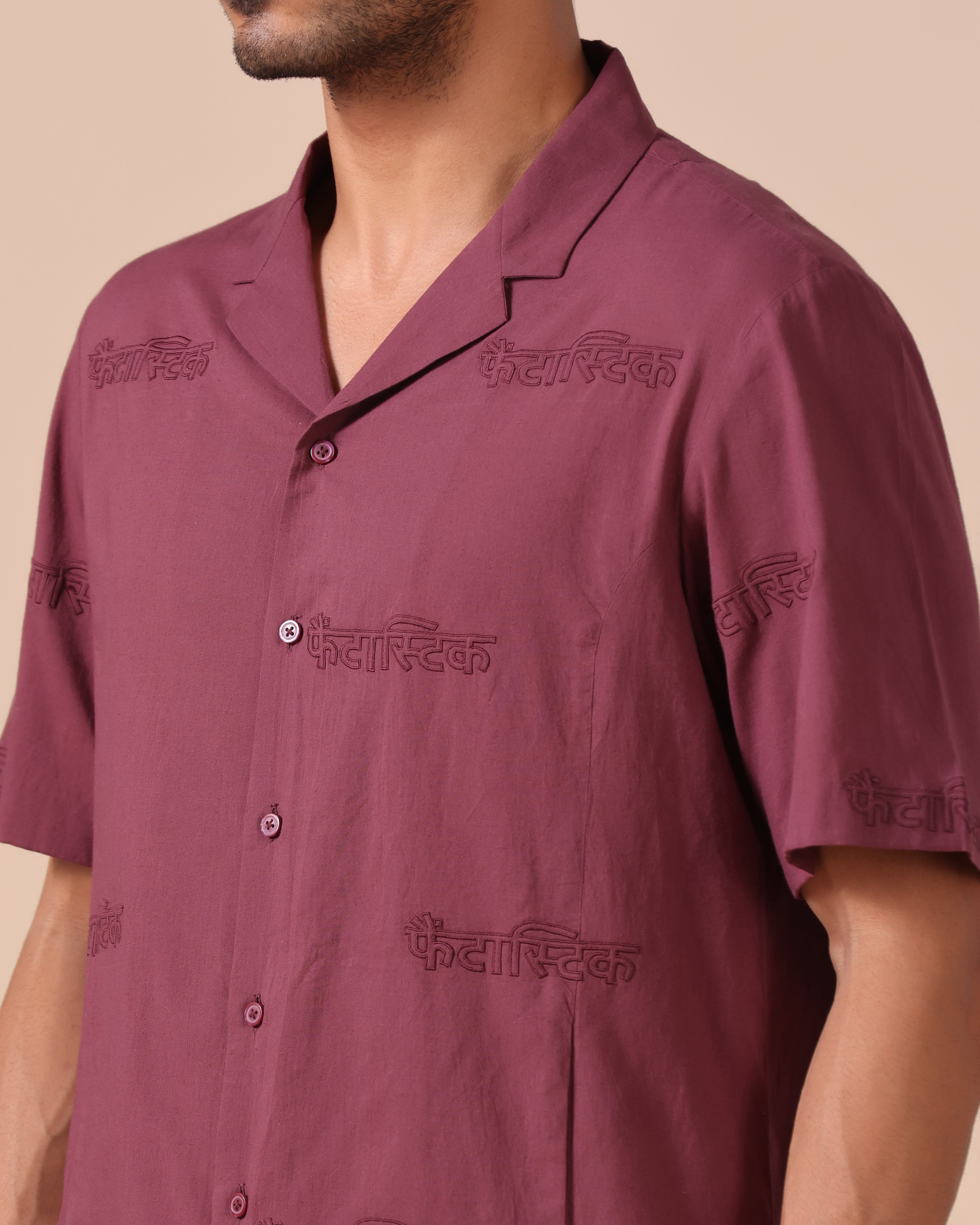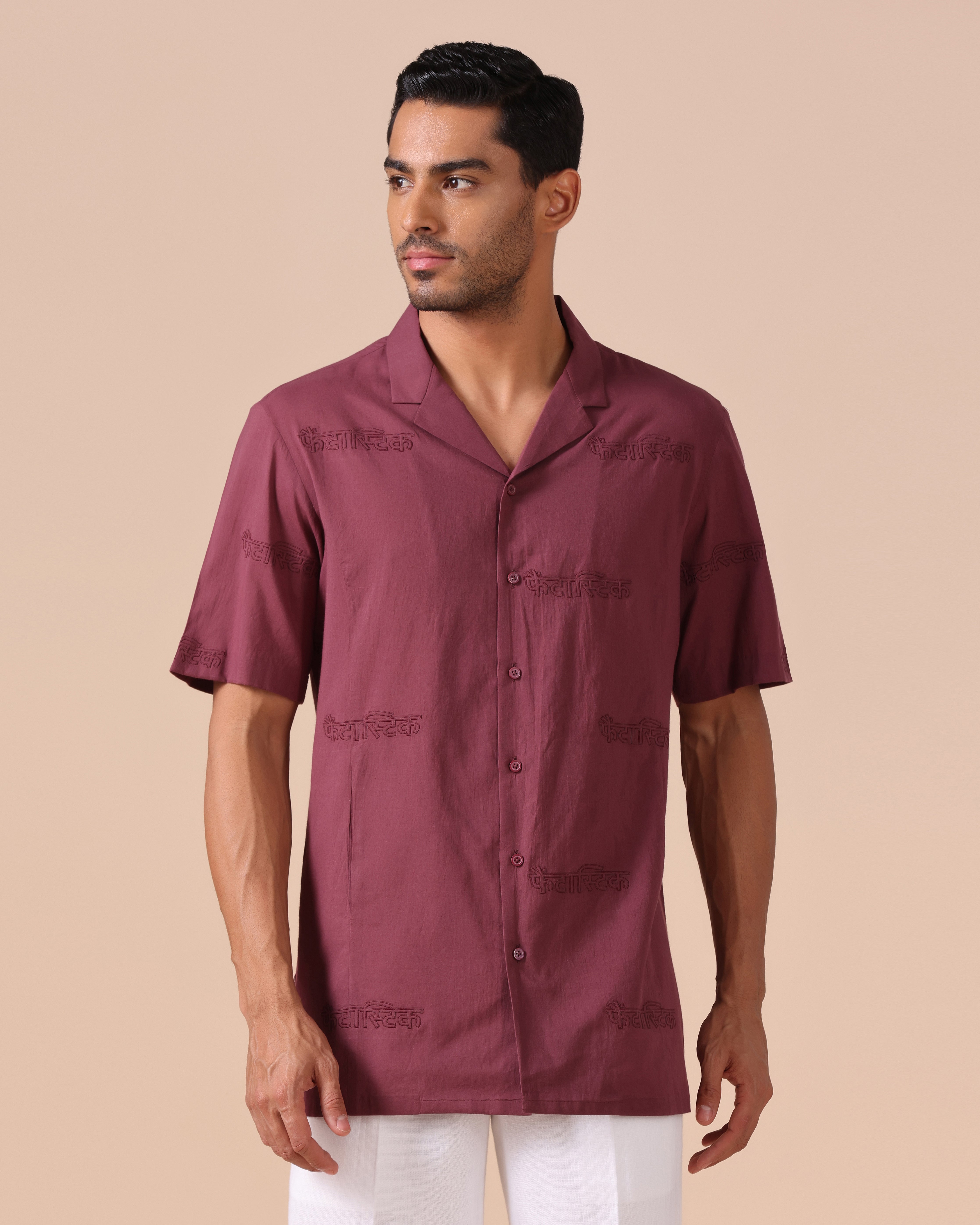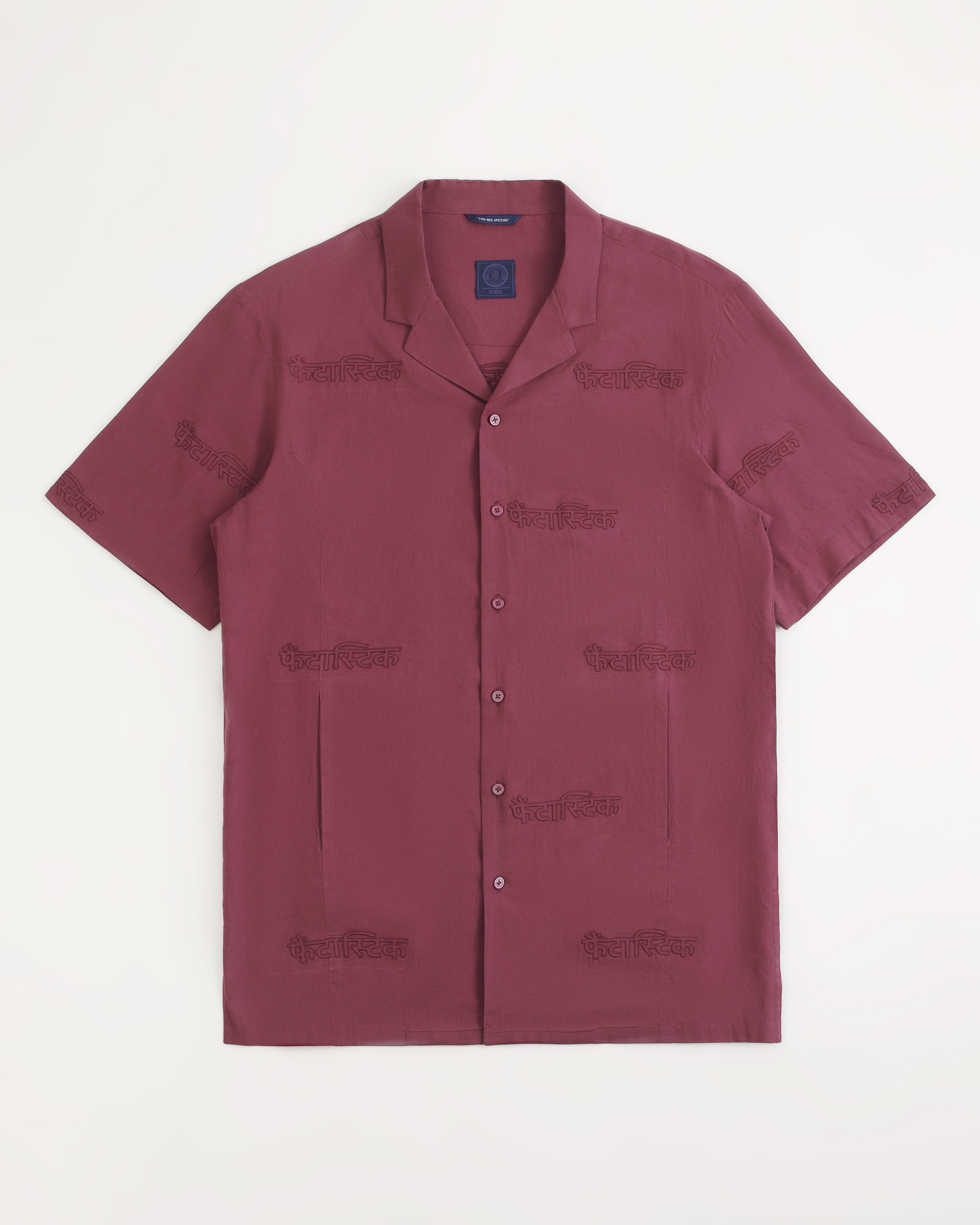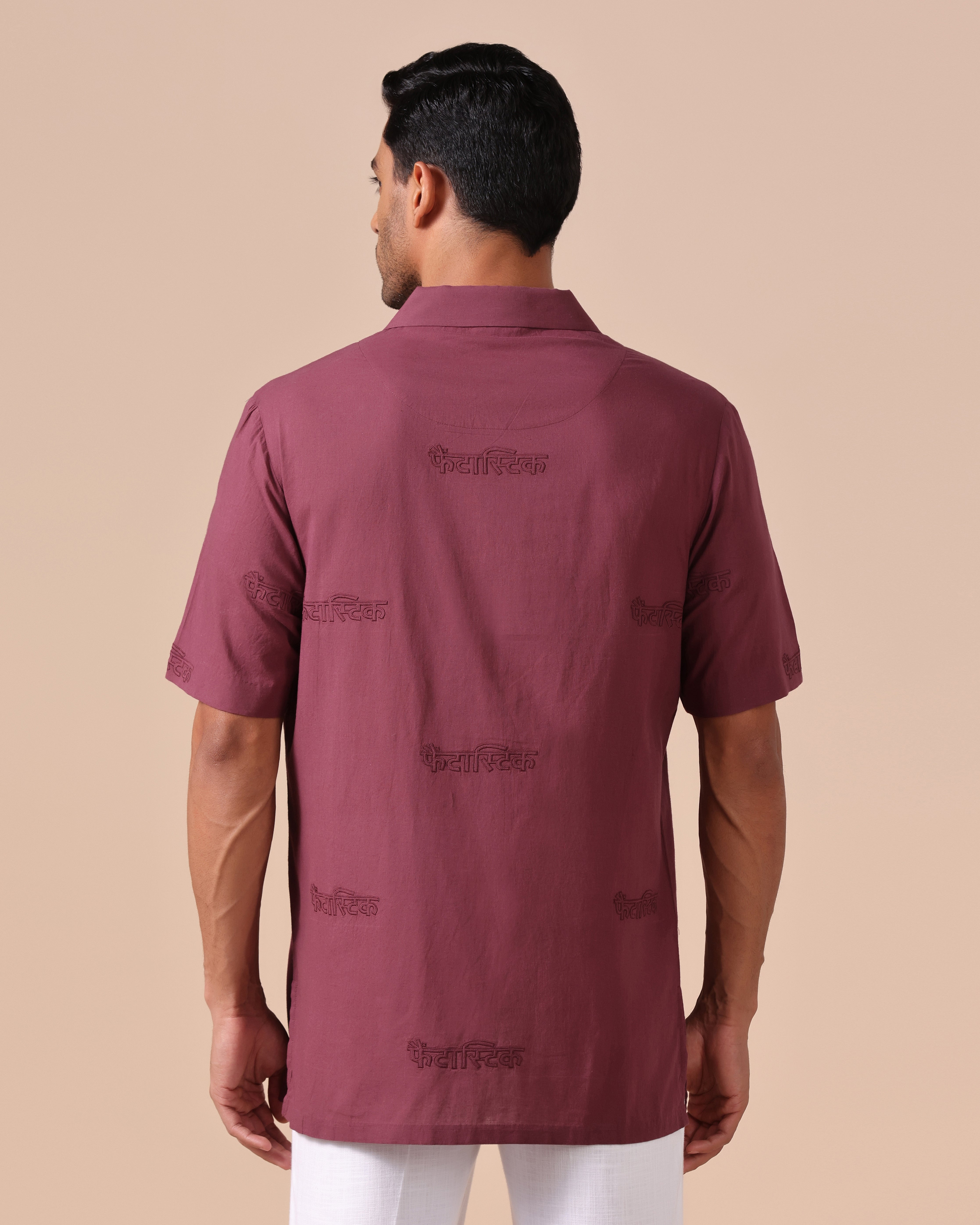 Rolled Up Collar Half Sleeve Shirt with Devanagari Cutwork Embroidery Allover